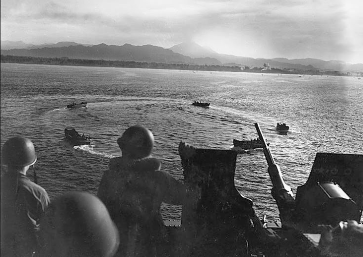 LCVP landing craft circling off Cape Torokina, Bougainville, Solomon Islands before landing