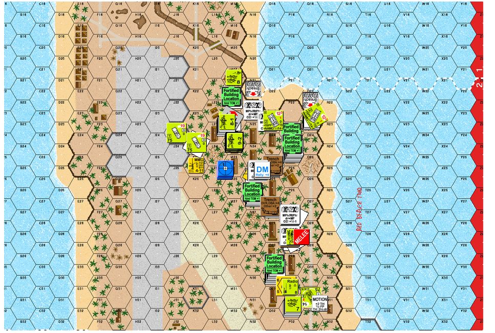 2013-11-17(D) Vic Lauterbach vs EVL American (USMC) winMarine kill stacks setup next to outer Japanese positions caused all them to fall by the end of GT2. Loses left no Japanese reserves for counterattacks to recover lost positions. Next time I would leave the outer ring of buidings empty and force Marine movement to get Japanese in LOS.