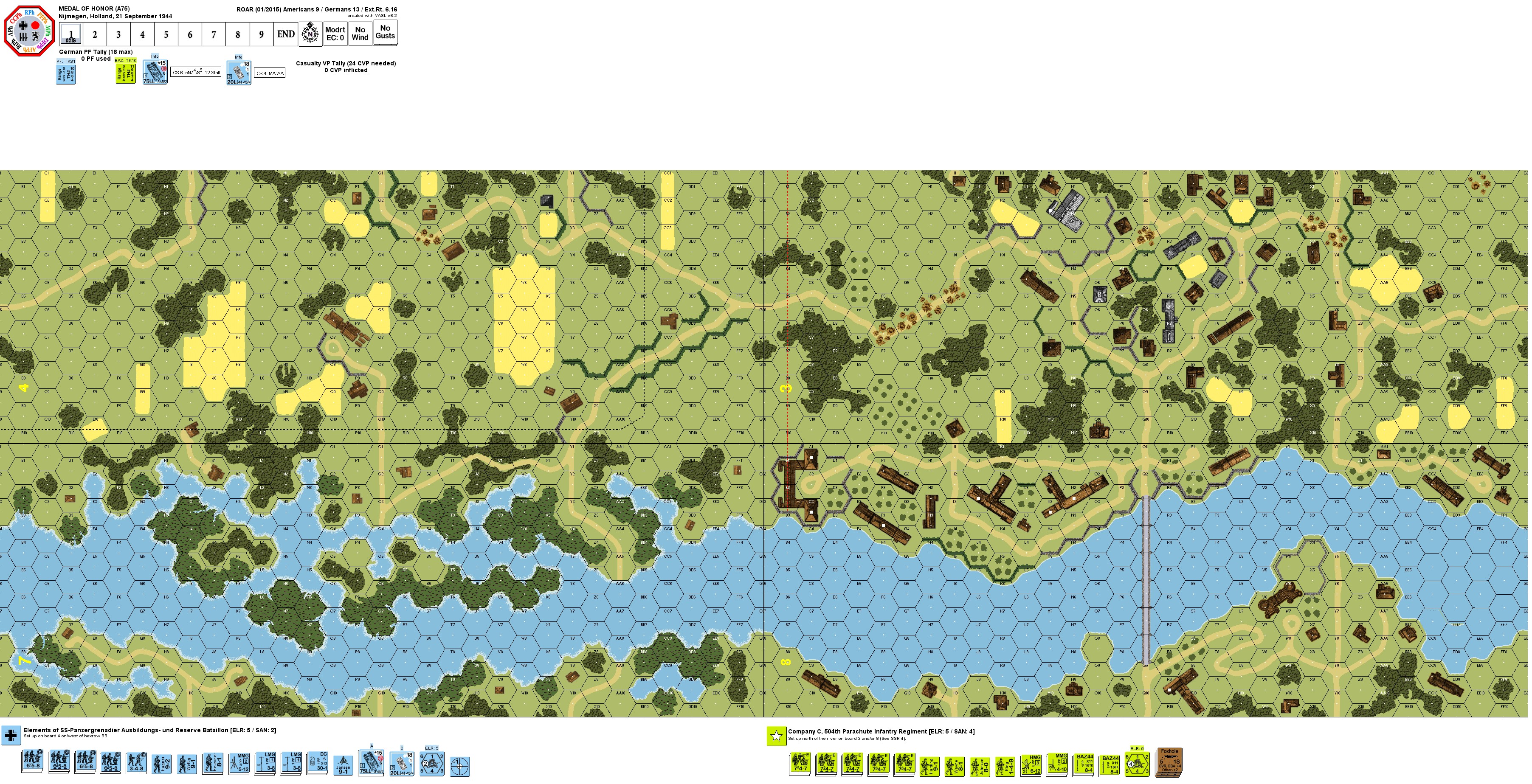 | Misc Rules: | Ov5, Hills and Cliff hexsides do not exist. River Waal is deep. |