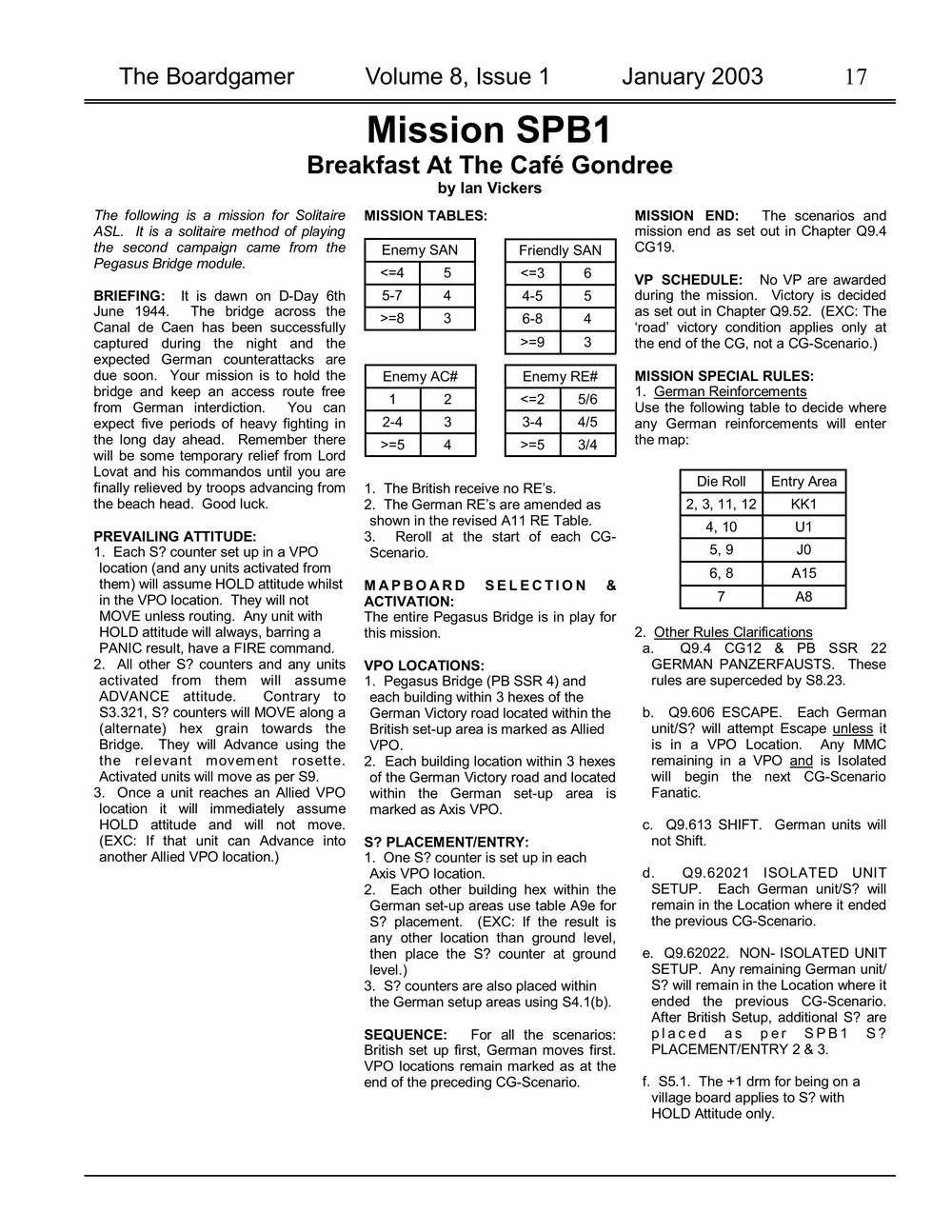 The following is a Solitaire method of playing the second campaign game from the Pegasus Bridge module. SEE 3 pages of RULES below. . .BRIEFING: It is dawn on D-Day 6th June 1944. The bridge across the Canal de Caen has been successfully capture during the night and the expected German counterattacks are due soon. Your mission is to hold the bridge and keep an access route free from German interdiction. You can expect five periods of heavy fighting in the long day ahead. Remember there will be some temporary relief from Lord Lovat and his commandos until you are finally relieved by troops advancing from the beachhead. Good luck.Attacker: Enemy (German) (No more details)