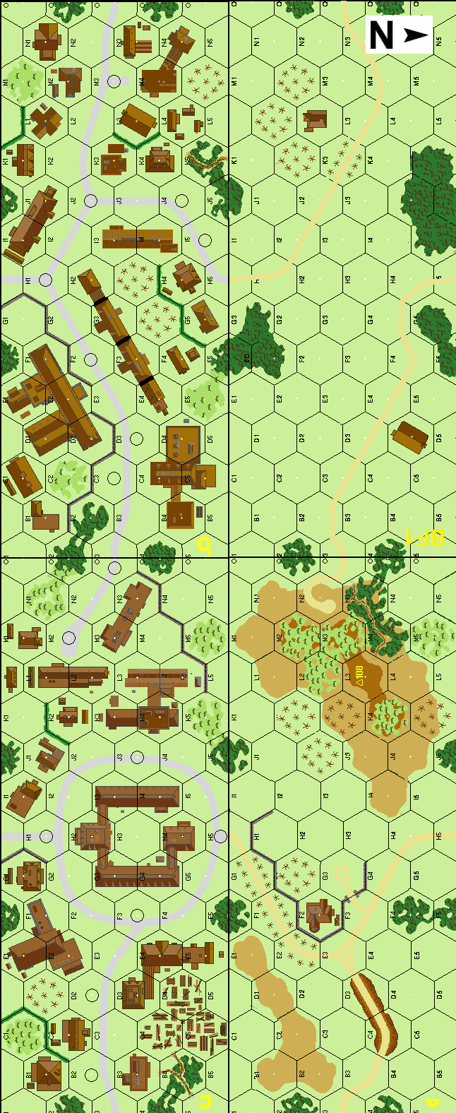 | Misc Rules: | All buildings are Wooden and single story, no hedges on Bd e |