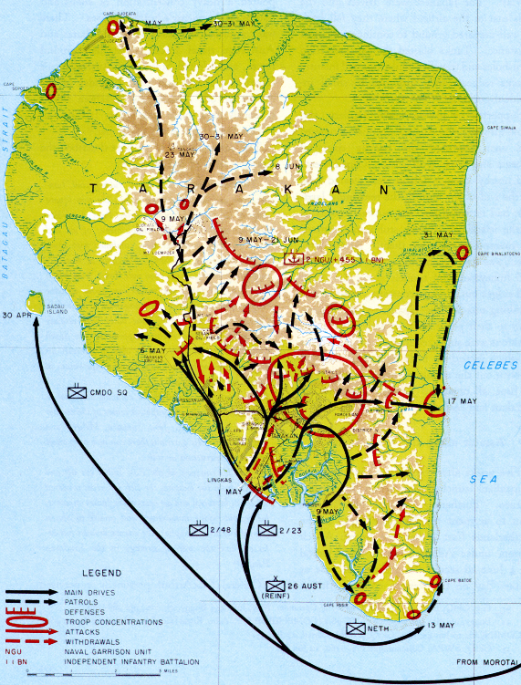 In late April 1945 an invasion fleet escorted by the cruiser HMAS Hobart and the destroyers HMAS Barcoo, Burdekin, Hawkesbury, Lachlan and Warramunga arrived off the south-western coast of Tarakan. Supported by heavy naval bombardment, on 30 April engineers destroyed the tangle of defences blocking a landing at Tarakan Island. Preceded by another naval bombardment and with heavy air cover, the 23rd and 48th Battalions went ashore against only light opposition the following day. Within an hour of landing 2/48th Battalion struck some slight opposition on the feature immediately north-east of Lingkas tank farm, but continued to advance and secured its portion of the covering position later in the day. Stiff resistance held up 2/23rd Battalion on a ridge north-west of Milko, which was captured the next day. This enabled the Battalion to advance northward and eastward, one company overcoming Japanese resistance in the King's Goss area. By nightfall on the second day, apart from isolated pockets, the only part of the covering position not held was Hospital Ridge, where the Japanese were strongly entrenched in bunkers and tunnels. This hold-up seriously affected the development of the beach maintenance area, as the road to the north of the contested feature was needed to complete a traffic circuit. The same day 2/48th Battalion occupied Lyons. Against some opposition 2/24th Battalion advanced rapidly to capture two hills nicknamed Sturt and Wills . .Attacker: Australian (Elements of 2/24th Battalion)