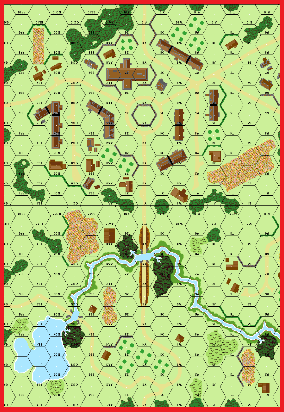 | Misc Rules: | Bldgs: Wooden, No bridges, Stream and Pond: Flooded with adjacent +2 DRM Bog Check. |