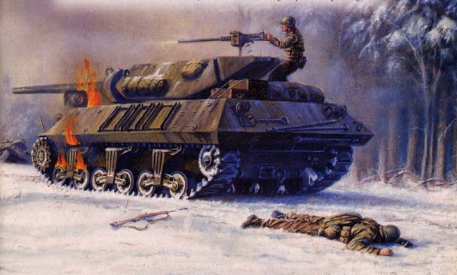 2LT Audie L. Murphy began his first day in command of B Company in the Reidwehr woods. During the night his thirty-two man company was reinforced with two M-10 tank destroyers and given orders to hold his position at the bottom of a āUā shaped patch of woods that faced the village of Holtzwihr, from which he could hear the sounds of German tanks and infantry assembling. At 1400, the Germans stormed out of Holzwihr with 250 infantrymen clad in white snow capes, supported by six tanks. Both M-10s were almost immediately knocked out. Murphy ordered his men to pull back, while he remained forward with his field phone to call for artillery. . .Attacker: German (Elements 106th Panzer Brigade; 708th Volksgrenadier Division)