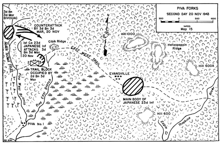 After the hard fighting on the Numa-Numa Trail earlier in the month, the Marines of the 3rd Division had finally pushed through the Palm Grove, future site of the two airstrips the entire operation desperately needed. Their next missions were to push east across the Piva River and along the East-West Trail, both to expand the beachhead perimeter and to set the stage for the assault on Hellzapoppin' Ridge. The Japanese were shelling the beachhead with artillery dug in on the ridge, and the only realistic route to there was along the trail. The Japanese were not going to relinquish this trail as easier than the Numa-Numa.Attacker: Japanese (23rd Infantry Regiment, 6th Infantry Division)
