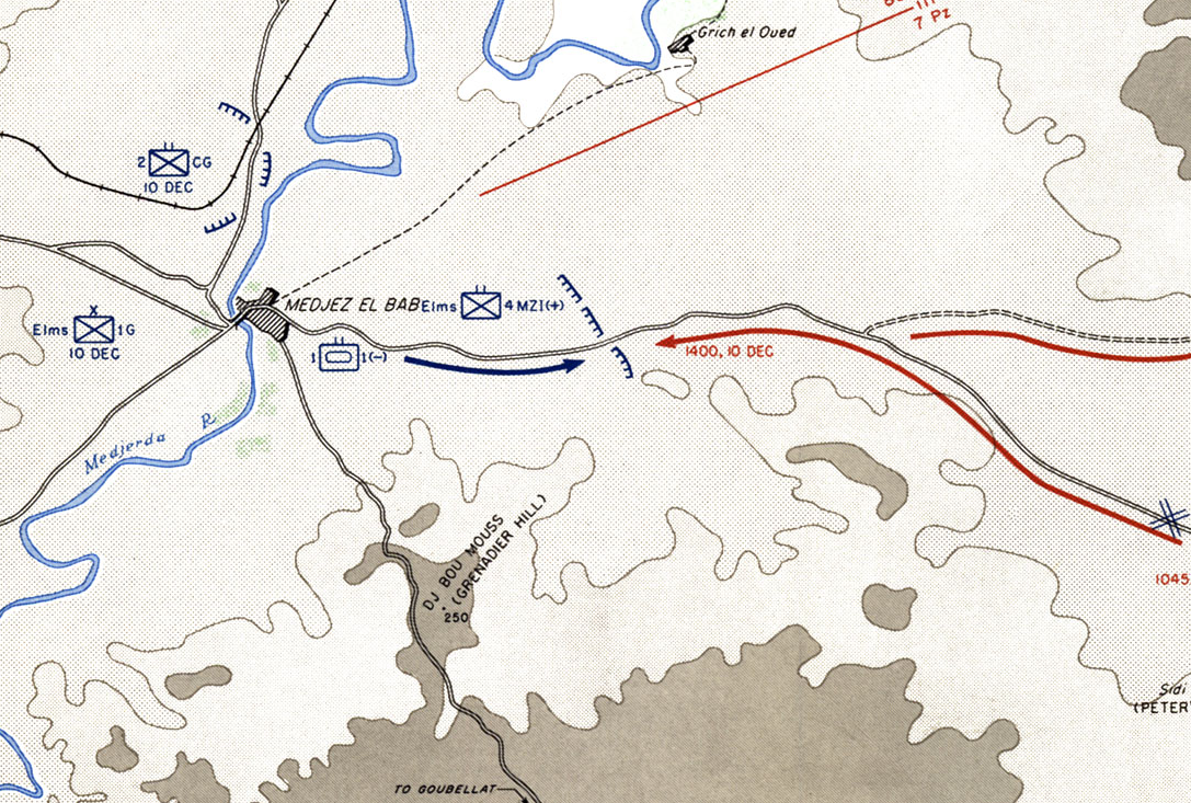 A counterattacking German column, including parts of the 7th Panzer Regiment and Tiger tanks of the 501st Panzer Battalion, was making a wide swing with the intent of striking Medjez el Bab from the southeast. Approximately 2 miles east of Medjez el Bab, the column ran into a roadblock manned by French troops with AT guns and artillery support. . .Attacker: German (Elements of Bataillon I of Panzer Regiment 7, schwere Panzer Abteilung 501 and Panzergrenadier Regiment 86)