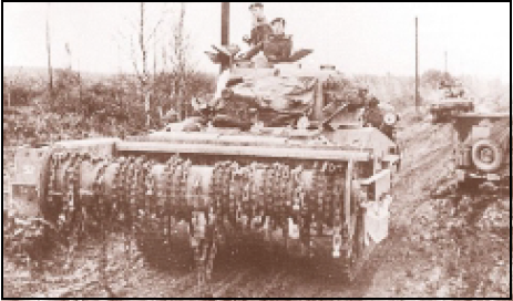 In the battles during the fall following “Market-Garden” the Germans were able to hold onto a bridgehead west of the Maas River, to the south of Nijmegen. For three straight months attacks were made to reduce this, and by the end of November the Germans had only three footholds on the west bank of the Maas. One of these was the town of Blerick, across the river from Venlo. The First Fallschirmjäger Army had left a detachment of troops to garrison the town, which had been turned into a fortress complete with minefields, trenches, and fortified buildings. Furthermore, an anti-tank ditch ringed the town. It fell upon the 44th Brigade of the 15th Scottish Infantry Division to wipe out this stronghold. After a night of rain, the attack opened at dawn with a tremendous bombardment of over 400 guns. The Scottish vehicles began to churn through the mud. After a Fall season of heavy rain, there was hardly any dry ground anywhere in Holland. One whole squadron of Churchills and several flail tanks bogged down even before making it to the starting line. With fire support from the Churchills, the flail tanks blasted lanes through the minefields and the A-T ditch was bridged and filled with fascines by engineer tanks. The infantry, due to murderous mortar, shell, and machine gun fire, was under orders to ride the Kangaroos all the way into the town itself; the vehicles were then to drive back and load up the second wave. Although in places the attack went so poorly the A-T ditch was not breached, in general the infantry, with armour support, cleared Blerick by the mid-afternoon, capturing 250 prisoners. Close co-operation between the infantry, armour, and armoured engineer vehicles kept Scottish casualties for the entire day to about 100.
