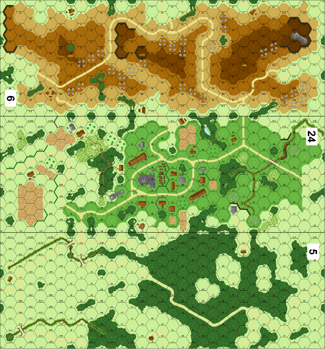 As the Gustav Line proved hard to crack by frontal assault, the Allied Command in Italy resorted to making concerted attacks by raiding parties and frontline troops at key points of the line. Specialized troops would be landed behind enemy lines by submarine and then travel to their objectives at night. One such mean, quick raid occurred at Littorno, base for a German btn HQ and key supply route site. Elements of the 701st Ranger Btn attacked ferociously and quickly, a pitched battle was raging in and around the village. The Hermann Goering Division, reponding to the cries for help from the village sent an armored detachment. At the same time, Armored elements from the 7th Division, exploiting a breach on the frontline, arrived on the scene. . . . .Victory Conditions: U.S. player secretly chooses before set-up to: 1) Control all buildings on Boards 24/5 --OR-- 2) Clear road 9Y10-9Q1 so that no Good Order German squad/AFV/ordnance exists with LOS to any of the road hexes. Any such squads must also be able to claim normal firepower on any one road hex that they have a LOS to. Any halving effects nullify their eligibility. Game ends the instant that the US player can claim victory.Attacker: American (701st Ranger Battalion and 51st Armored Regiment)