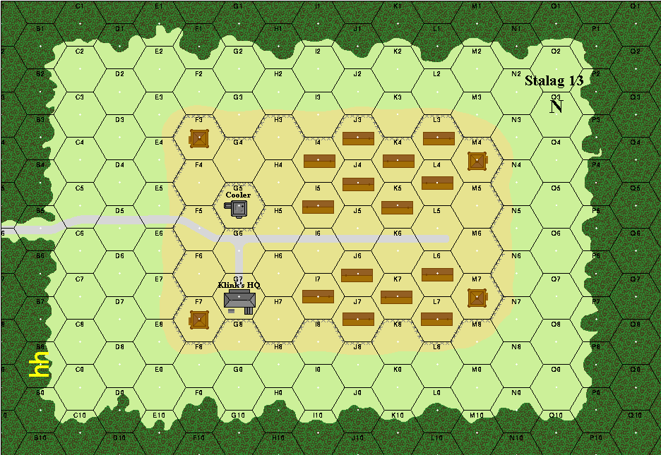 SEE Misc file and VASL board below. ..Fantasy Scenario: Escape from Stalag 13. Major Hochstetter, hearing that Hitler was dead, went mad. Rounding up his fanatic henchmen, Hochstetter declared that he would have his revenge on the prisoners of Stalag 13, especially on Col. Hogan. Discovering the plot through the underground, Col. Hogan pleaded for help from the approaching allies. Not knowing when help would arrive, Col. Hogan began to plan a mass escape through the tunnels. However, fate intervened when Gen. Burkhalter, believing that the Americans would never allow the Russians to kill the brother of an American, drove through the gates searching for a suitable bridegroom for his sister. After being dismissed from roll call, Hogan decided an armed break out was the only way. Arming the men in his barracks, Hogan signalled the other barracks to be ready. . .Attacker: Prisoners (Hogan's Heroes/POW's/Col. Crittenden's Relief Force)