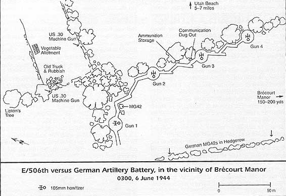 The airborne drop into Normandy left many soldiers alone and isolated. The first priority was to locate their unit and then attack their objectives. In many cases, no more than a hand full of soldiers managed to come together and it then fell upon them to achieve their objectives with what little manpower they had. One such case was at Brecourt Manor. . . .Lt. Richard Winters and ten men from E Company of the 506th PIR were charged with destroying a battery of 105mm guns at Brecourt Manor. Armed with only a light mortar, two light machineguns, two Tommy guns, and five rifles they had to attack a fifty-man guard dug in behind hedgerows with trenches and clear fields of fire.Attacker: American (No more details)