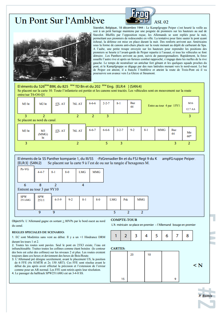 "A Bridge on the Ambleve"- Kampfgruppe Peiper collided the night before with a small roadblock maintained by a handful of pioneers on the heights south of Stavelot. Bluffed by the opposition received, the Germans retreated for the night, allowing the pioneers to go back down to the city. The attempt to blow up the bridge having failed, the defense is put into place during he night. Reinforcements arrive to the Americans in the form of anti-tank cannons placed on the road leading to the Spa fuel depot. At dawn. a small troop sent to the heights to take up the positions of the pioneers, collided with Pieper's vanguard who had gone back on the assault, and all vehicles were destroyed. The Panthers arrived at the bridge, followed by Panzergrenadiers. Quickly, the force assaulted the other bank and after furious close combat , engaged in the alleys of the left bank. With time to neutralize a very embarrassing anti-tank gun and the few squads close to the bridge, the Kampfgruppe is released by side streets leading to the northwest. Peiper's goal is reached, he has crossed the Ambleve and reached the road of Trois-Pont where he will continue his advance towards La Gleize amd StoumontAttacker: German (SS) (SS Panther Kompanie 1 and III/SS PanzerGrenadier Battalion and Fallschirmjager Regiment 9, Kampfgruppe Peiper)