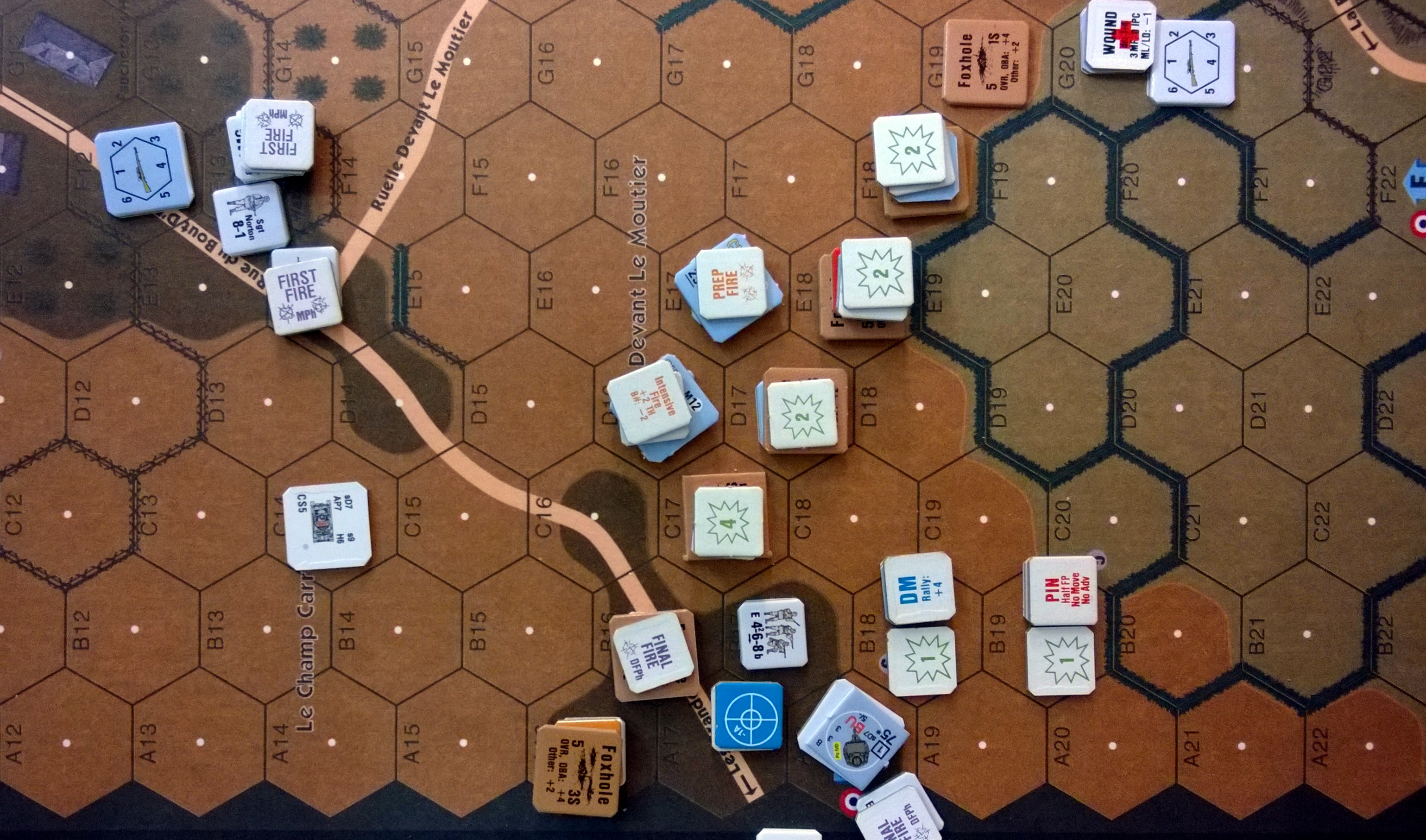 In my second third turn I was able to outflak the French position with the last tank and 2 squads and from there interdicted to roud of a couple of squads while staying out of los from the guns and got back i nthe lead in CVP.