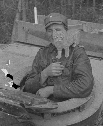 Finnish StuG crew member with "Mirre", cat mascot, who was always with them, even during a battle. The photo was at the Northern side of the Vuosalmi