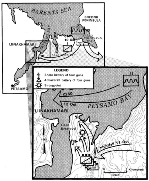 During the summer of 1944, the Karelian Front organized special purpose-forces to conduct raids against German shore installations along the northern coast of Finland. One of the units, a composite detachment of sailors and marines from the Northern fleet was tasked with preparing the area around cape Krestovyi for an invasion by 14th Army. One group was to attack the battery of 150-mm coastal guns defending the approaches, while the other led by Sr Lt. WN Leonov, was to attack the 88-mm antiaircraft battery. Hiding in the bushes nearby on Oct 11, the Soviet raiders-along with some naval artillery crews--set out on their raid at nightfall.Attacker: Russian (Northern Fleet Reconnaissance Detachment)
