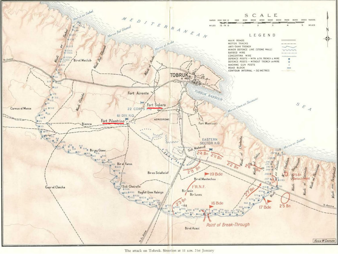 Tobruk was held by 25,000 men, including General della Mura's 61st Sirte Division, 45 light and 20 medium machine-guns, 200 guns, and ringed with anti-tank ditches, as well as two forts, Solaro and Pilastrino. O'Connor kept his Aussies moving forward in the face of supply shortfalls, worn out vehicles, and the need to use captured Italian tanks painted with the leaping kangaroo symbol. O'Connor planned to hit Tobruk from the town's southeast corner and the assault jumped off on 21 January, delayed three days by dust storms. Italian posts began to fall, and the Australian drive picked up steam while the defenses collapsed under accurate Australian artillery fire.Attacker: Australian (19th Australian Infantry Brigade)
