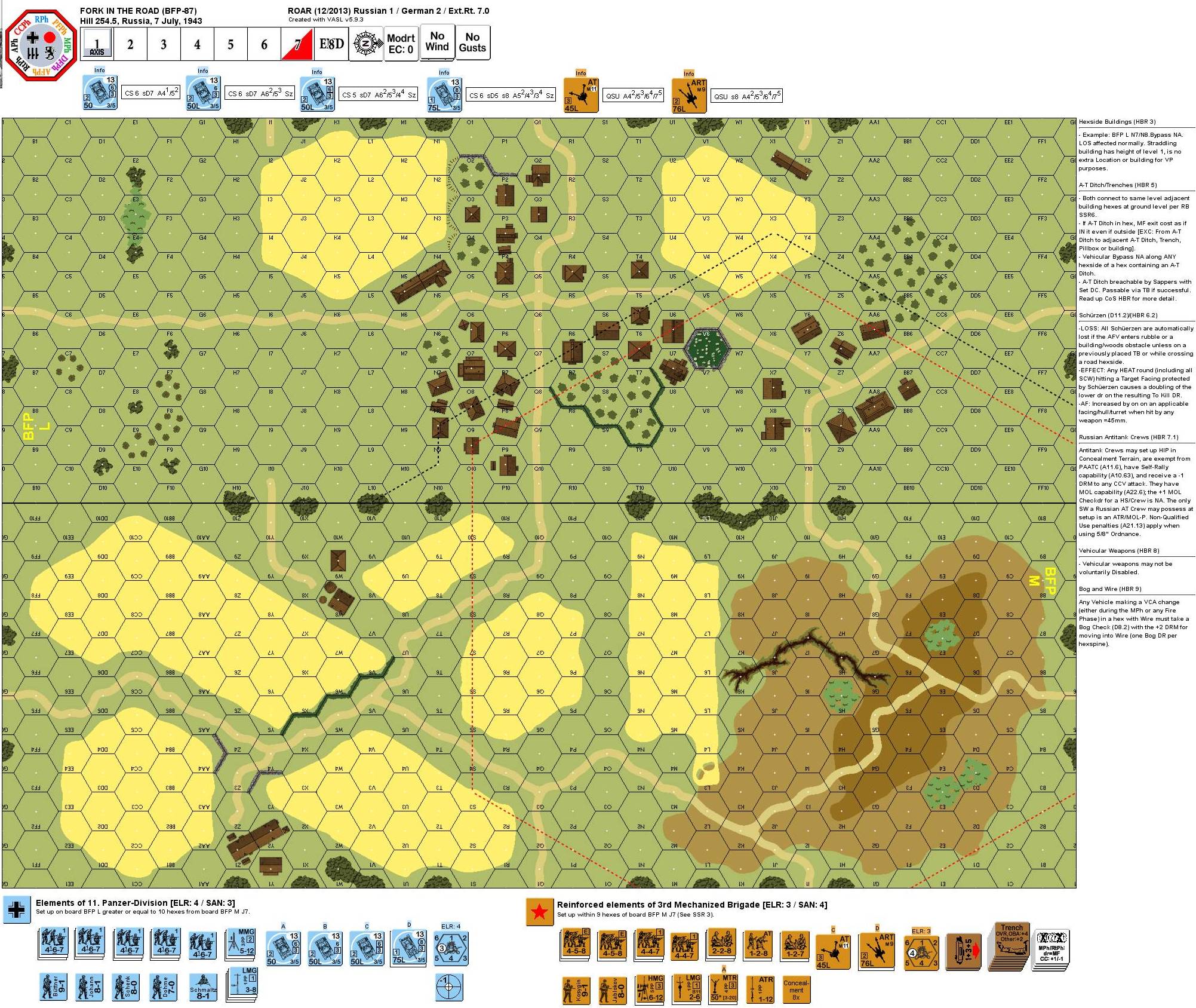 Both sides were feeling the effects of several days of fighting, suffering severe casualties. The 48th Panzer Corps retained the mission of advancing on Obian and protecting the flank of SS Panzer Corps II. This mission could be accomplished, but was more difficult because the SS had directed its attack route towards Prohorovka to the northeast. The Soviets were forced to bolster their defenses with nearly depleted units such as the remnants of the 52nd Guards Rifle Division. Elements of the 11th Panzer fought their way to Hill 254.5. A platoon from 3rd Battery, 35th Antitank Artillery Regiment defended a fork in the road with its 76mm guns.Attacker: German (Elements of Panzer Division 11)