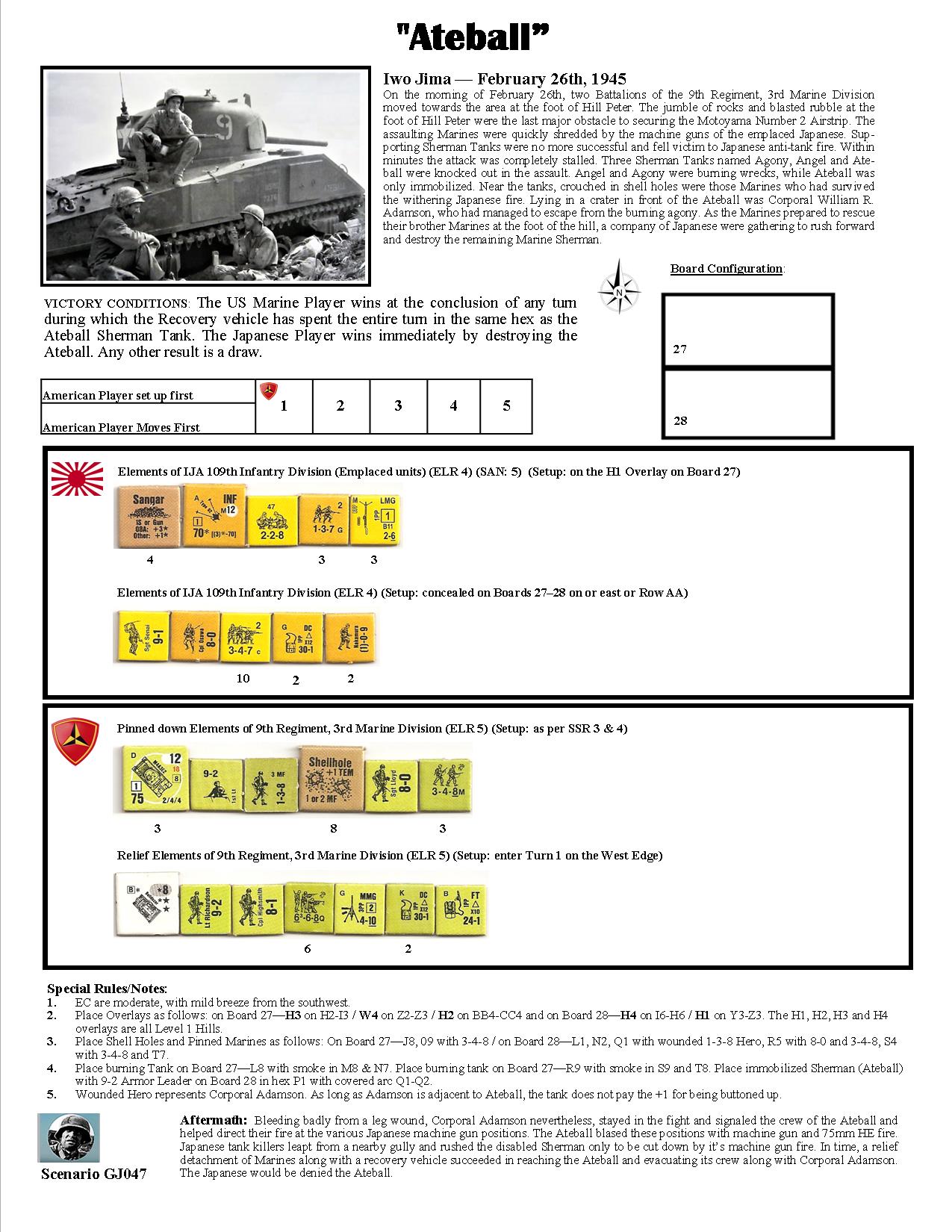 On the morning of February 26th, two Battalions of the 9th Regiment, 3rd Marine Division moved towards the area at the foot of Hill Peter. The jumble of rocks and blasted rubble at the foot of Hill Peter were the last major obstacle to securing the Motoyama Number 2 Airstrip. The assaulting Marines were quickly shredded by the machine guns of the emplaced Japanese. Supporting Sherman Tanks were no more successful and fell victim to Japanese anti-tank fire. Within minutes the attack was completely stalled. Three Sherman Tanks named Agony, Angel and Ateball were knocked out in the assault. Angel and Agony were burning wrecks, while Ateball was only immobilized. Near the tanks, crouched in shell holes were those Marines who had survived the withering Japanese fire. Lying in a crater in front of the Ateball was Corporal William R. Adamson, who had managed to escape from the burning agony. As the Marines prepared to rescue their brother Marines at the foot of the hill, a company of Japanese were gathering to rush forward and destroy the remaining Marine Sherman. Bleeding badly from a leg wound, Corporal Adamson nevertheless, stayed in the fight and signaled the crew of the Ateball and helped direct their fire at the various Japanese machine gun positions.Attacker: American (USMC) (9th Regiment, 3rd Marine Division)
