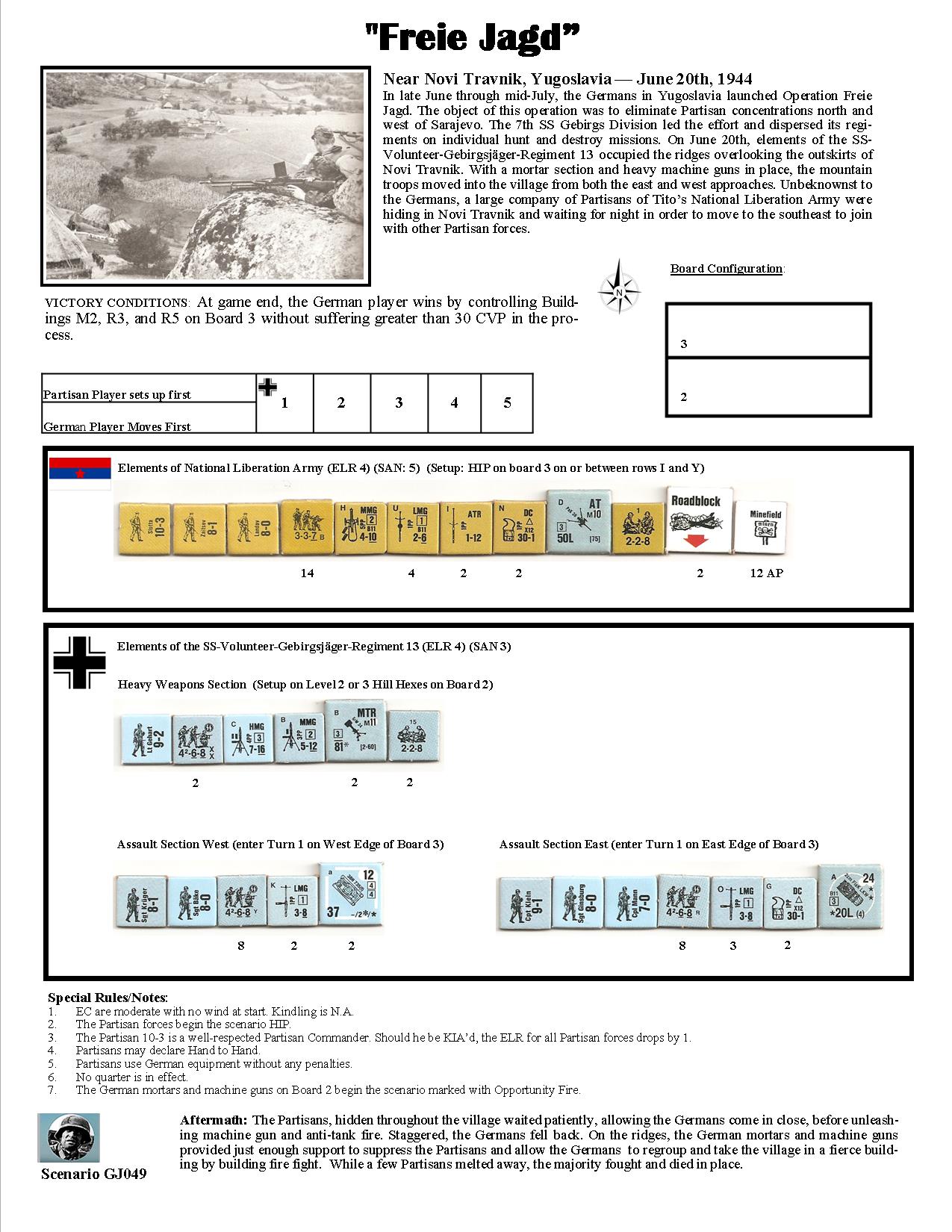 In late June through mid-July, the Germans in Yugoslavia launched Operation Freie Jagd. The object of this operation was to eliminate Partisan concentrations north and west of Sarajevo. The 7th SS Gebirgs Division led the effort and dispersed its regiments on individual hunt and destroy missions. On June 20th, elements of the SS-Volunteer-Gebirgsjäger-Regiment 13 occupied the ridges overlooking the outskirts of Novi Travnik. With a mortar section and heavy machine guns in place, the mountain troops moved into the village from both the east and west approaches. Unbeknownst to the Germans, a large company of Partisans of Tito’s National Liberation Army were hiding in Novi Travnik and waiting for night in order to move to the southeast to join with other Partisan forces.Attacker: German (SS) (7th SS Gebirgs Division "Prinz Eugen")