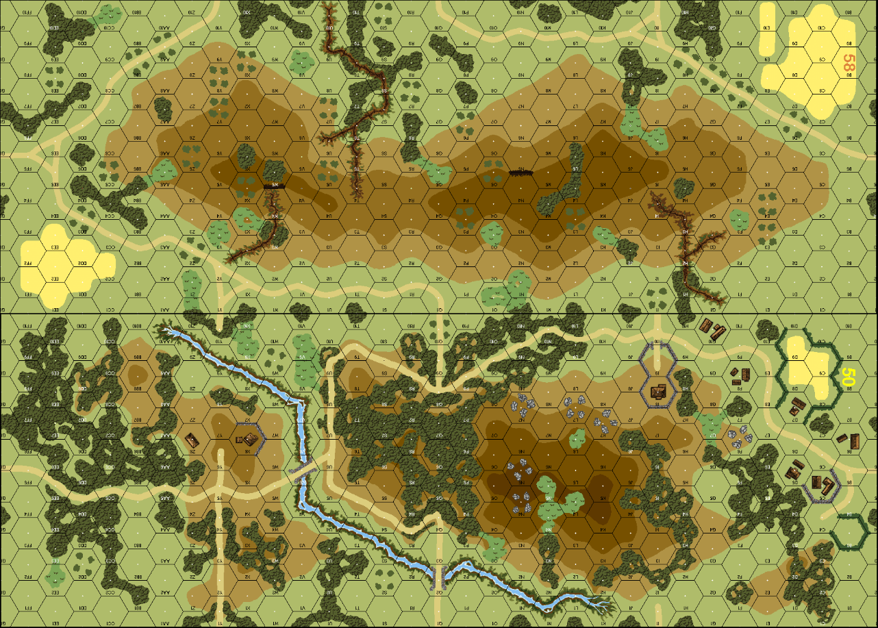 Playtest Scenario card available at Fanatic Ent. Designer's Corner. . . .It is common knowledge that the war in the Balkans was one of unsurpassed violence. The familiarity of the various factions combined with the centuries old smouldering ethnic conflict created a unique and vicious quality in the fighting. Early in May 1942 an operation exemplifies this fact. The goal of the Croatian forces was to engage and destroy Partisan concentrations in the Petrova Mountains. The Croatian forces under the command of the Utinjski Brigade advanced east, southeast and south into the Mountain range in an attempt to encircle the enemy. For several days the Partisans attempted to pierce the cordon as it slowly took form. By the 14th, major elements of the Partisan forces had broken out. During the operation Croatian forces burned villages and committed total war on the civilian population. This was truly war with no quarter.Attacker: Partisan (1st Kordun NOP Detachment)