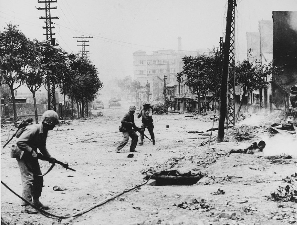 The Marines entered Seoul shortly after 7:00 am on September 25 to find it heavily fortified. Buildings were heavily defended by machine guns and snipers, and on Ma Po Boulevard, the main road through the city, the KPA had established a series of 8-foot-high barricades of burlap bags, typically filled with either sand or rice. Located about 200-300 yards apart, each major intersection of the city featured such a barricade, the approaches to which were laced with mines, and which were usually defended by a 45mm anti-tank gun and machine guns. Each had to be eliminated one at a time, and it took the Marines, on average, 45–60 minutes to clear each position. Casualties mounted as the Americans engaged in heated house-to-house fighting. Anxious to pronounce the conquest of Seoul on MacArthur's insistence by the third-month anniversary of the war, Major General Almond declared the city liberated on September 25, although Marines were still engaged in house-to-house combat (gunfire and artillery could still be heard in the northern suburbs). Effective resistance would cease by September 27.Attacker: American (3rd Battalion, 1st Marine Regiment)