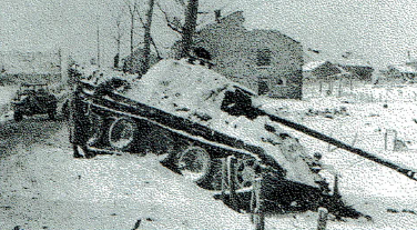 Reworking of "Time For Lunch" snow added. . .Locked at the bottom of a steep slope leading down from the sinister Baugnez road junction, the little town of Ligneuville was occupied by the 49th AAA Brigade HQ along with company kitchens, supply trucks and some troops and tanks of the 9th Armored Division doing repair work on tank tracks. Suddenly in the early afternoon, a tankdozer came flying down the hill at breakneck speed announcing imminent danger. As sounds of battle were heard coming from somewhere to the north, General E.J. Timberlake and his staff decided to leave at once. The incredulous officer in charge of the 9th Armored supply column went up the hill to investigate and. . was captured while standing face to face with German tanks. . .Attacker: German (SS) (Elements of Kampfgruppe Peiper)