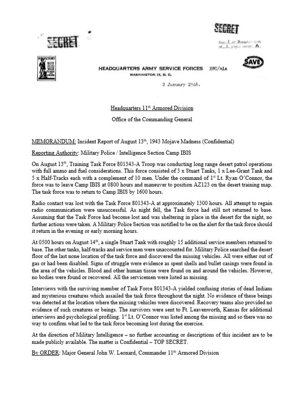 For months, the tankers of the 11th Armored Division had been training in the California desert at Camp IBIS. Located in the land of the Mojave Indians, the tankers had been warned to avoid the area near Dead Mountain Wilderness. For the most part the tankers had complied...until a training group became lost on August 13th, 1943. As night set, the group found themselves deep in the Dead Mountain Wilderness. Let by Lt. Ryan O’Connor, the training group finally orientated themselves and made for a mountain pass to their east. Low on fuel, some of the vehicles ran out of gas. Some of the troopers jumped on the available vehicles, while others followed on foot. Then...a long dead...evil began to emerge from nearby caves and move towards the unsuspecting tankers. The Mojave had warned them...Attacker: American (11th Armored Division Training Class 801343-A)