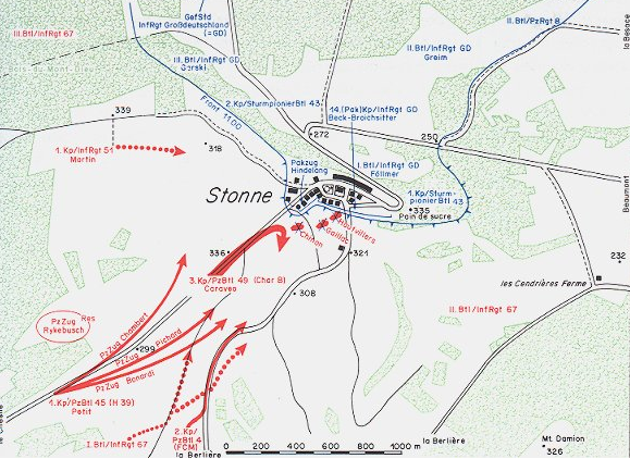 The Großdeutschland Regiment, after some hard fighting and a harder march north, had finally taken the village of Stonne, the pivot of the German flank movement from Sedan. Exhausted, the German infantry was now the target for one of the few determined French counterattacks of the entire campaign. Supported by infantry from the 3rd Motorized Division, an element of the 3rd Armored Division hurled itself at Stonne. It promised to be a hard day for the Großdeutschland.Attacker: French (45ème and 49ème Bataillons de Chars de Combat, 3ème Division Cuirassée and 51ème Régiment d'Infanterie, 3ème Division d'Infanterie Motorisée)