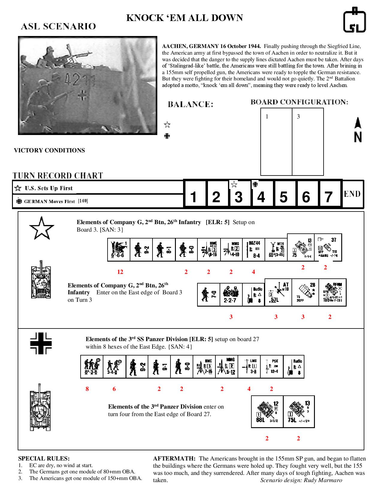 Finally pushing through the Siegfried Line, the American Army first bypassed the town of Aachen in order to neutralize it. But it was decided that the danger to the supply lines dictated Aachen must be taken. After days of "Stalingrad-like" battle, the Americans were still battling for the town. After bringing in a 155mm self propelled gun, the Americans were ready to topple the German resistance. But the Germans were fighting for their homeland and would not go quietly. The 2nd Battalion adopted the motto "Knock 'em all down", meaning they were ready to level Aachen.Attacker: German (SS)/German (3rd SS Panzer-Division and 3rd Panzer-Division)