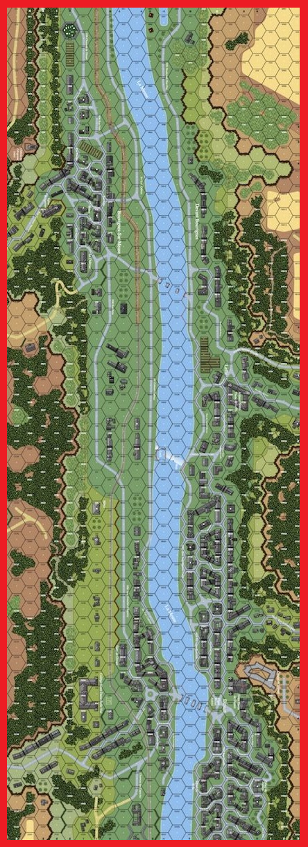 As the German blitzkrieg moved through the Ardennes, the Belgian Chasseurs d'Arrdgennais fought a series of delaying actions. They were pressured from every side, until they finally reached the Meuse. There they were forced to move northward to maintain contact with the rest of the Belgian Army. . . . . The scenario takes place before the main effort at Dinant, with a single bridge still standing across the river. Most of the Belgian force starts out strung out along the east bank, covered by a handful of west bank units. German units come from all sides: armored cars from the north, the bulk of their infantry from the south, and a few units can come in from the east. The Belgians have to get most of their CVP across the river (to aid in this effort, they have 6 wagons worth 3 CVP by SSR), then set DC on the bridge and blow it up. Otherwise the Germans win.Attacker: German (Kradschützen-Auflarüngs-Kompanie, Panzer-Division 5)