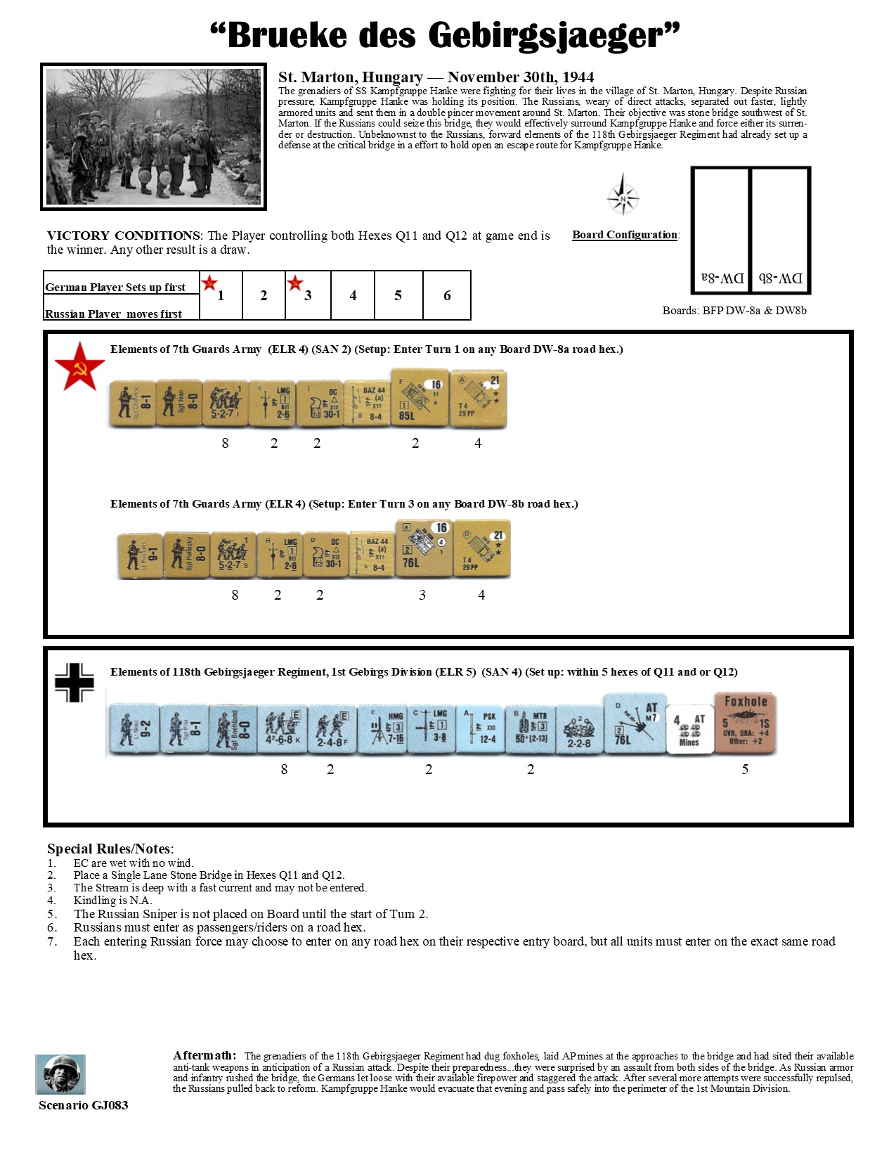 The grenadiers of SS Kampfgruppe Hanke were fighting for their lives in the village of St. Marton, Hungary. Despite Russian pressure, Kampfgruppe Hanke was holding its position. The Russians, weary of direct attacks, separated out faster, lightly armored units and sent them in a double pincer movement around St. Marton. Their objective was a stone bridge southwest of St. Marton. If the Russians could seize this bridge, they would effectively surround Kampfgruppe Hanke and force either its surrender or destruction. Unbeknownst to the Russians, forward elements of the 118th Gebirgsjaeger Regiment had already set up a defense at the critical bridge in a effort to hold open an escape route for Kampfgruppe Hanke.Attacker: Russian (Elements of 7th Guards Army)