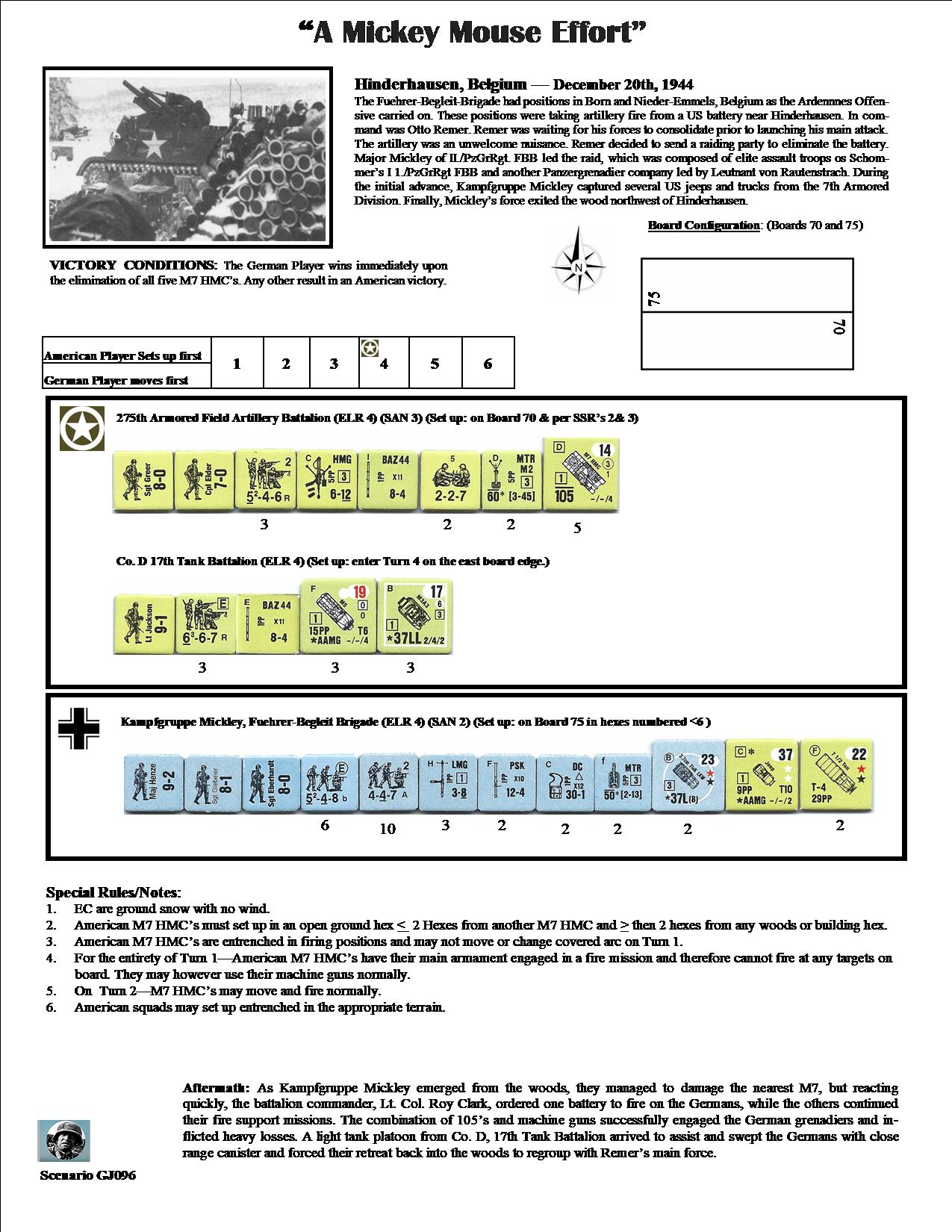 The Fuehrer-Begleit-Brigade had positions in Born and Nieder-Emmels, Belgium as the Ardennes Offensive carried on. These positions were taking artillery fire from a US battery near Hinderhausen. In command was Otto Remer. Remer was waiting for his forces to consolidate prior to launching his main attack. The artillery was an unwelcome nuisance. Remer decided to send a raiding party to eliminate the battery. Major Mickley of II/PzGrRgt, FBB led the raid, which was composed of elite assault troops of Schommer's I 1./PzGrRgt FBB and another Panzergrenadier company led by Leutnant von Rautenstrach. During the initial advance, Kampfgruppe Mickley captured several US jeeps and trucks from the 7th Armored Division. Finally, Mickley's force exited the woods northwest of Hinderhausen.Attacker: German (Kampfgruppe Mickley, Fuehrer Begleit-Brigade)