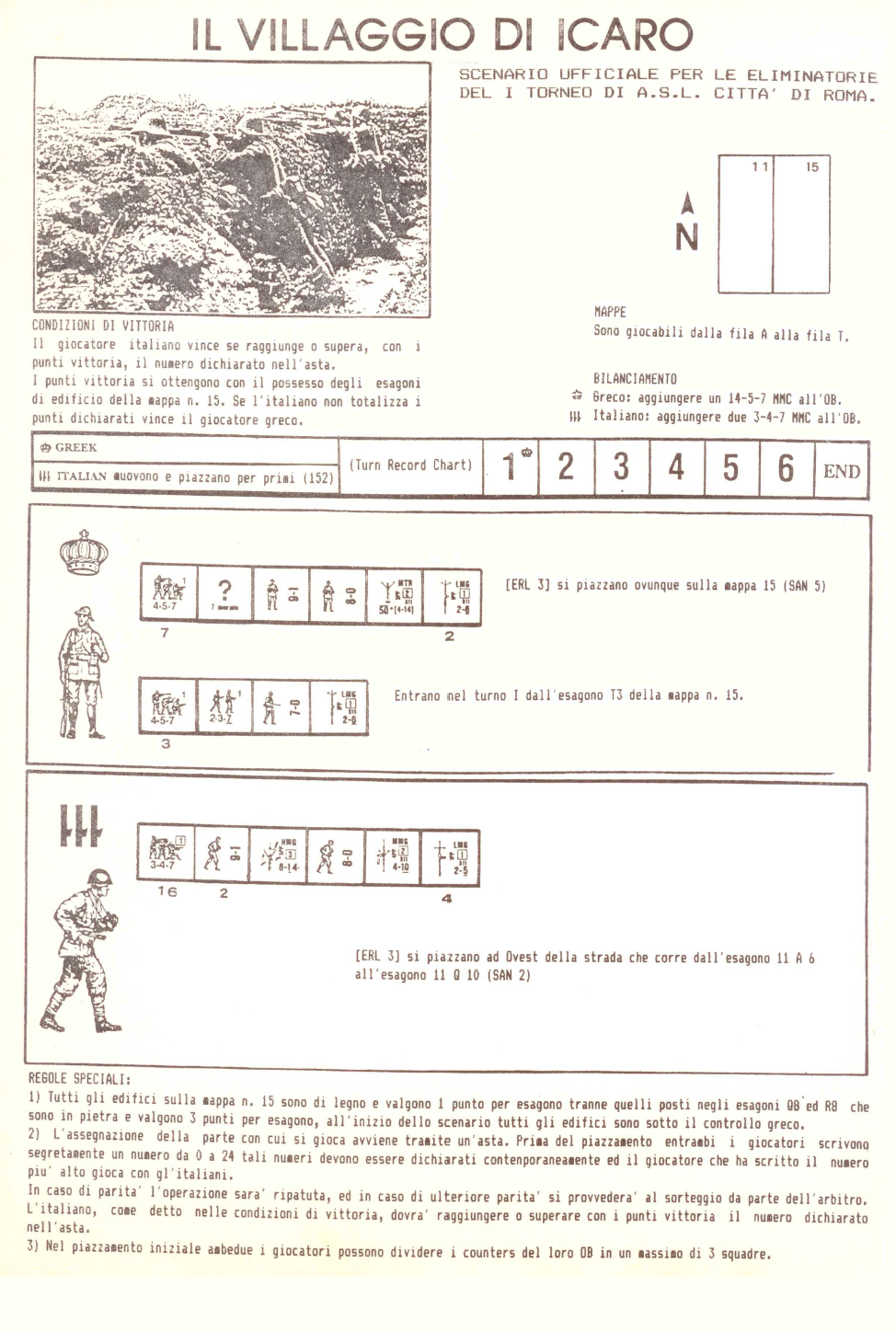 SPECIAL RULES: 1) All buildings on map 15 are wooden and worth 1 point per hex except those placed in hexes Q8 and R8 which are stone and worth 3 points per hex, at the beginning of the scenario all buildings are under Greek control. . .2) The assignment of the side with which you play is done through an auction. Before the draw, both players secretly write a number from 0 to 24, these numbers must be declared concurrently and the player who wrote the highest number plays with the Italians. . . .3) In the initial setup, both players can split their OB counters into up to 3 teams. . . .
