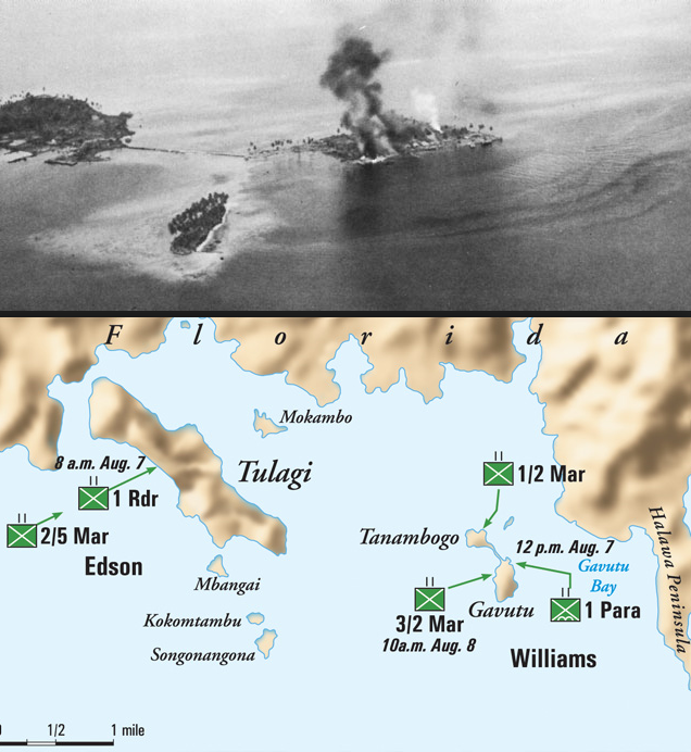 Following the costly repulse of Company B of the 2nd Marine Regiment on Tanambogo, the 3rd Battalion of the 2nd Marines was ordered to land on Gavutu at dawn, relieve the exhausted paratroopers, and capture Tanambogo by the end of the day. Ashore at 0700 that Saturday, the 3rd Battalion spent the morning methodically blasting the Japanese out of cave emplacements with TNT. At 1330, with Gavutu secured, they turned their attention to the island across the inlet. A two pronged attack was settled on. Company I, along with two tanks and supported by continuous air and naval bombardment, would make an amphibious assault on the same beach where the night attack had come to grief. Meanwhile, a platoon of K Company would rush across the causeway on foot to outflank the Japanese defenders on the hill.Attacker: American (USMC) (1st Platoon, Company K and Company I 3rd Battalion, 2nd Marine Regiment and Company B, 2nd Marine Tank Battalion)