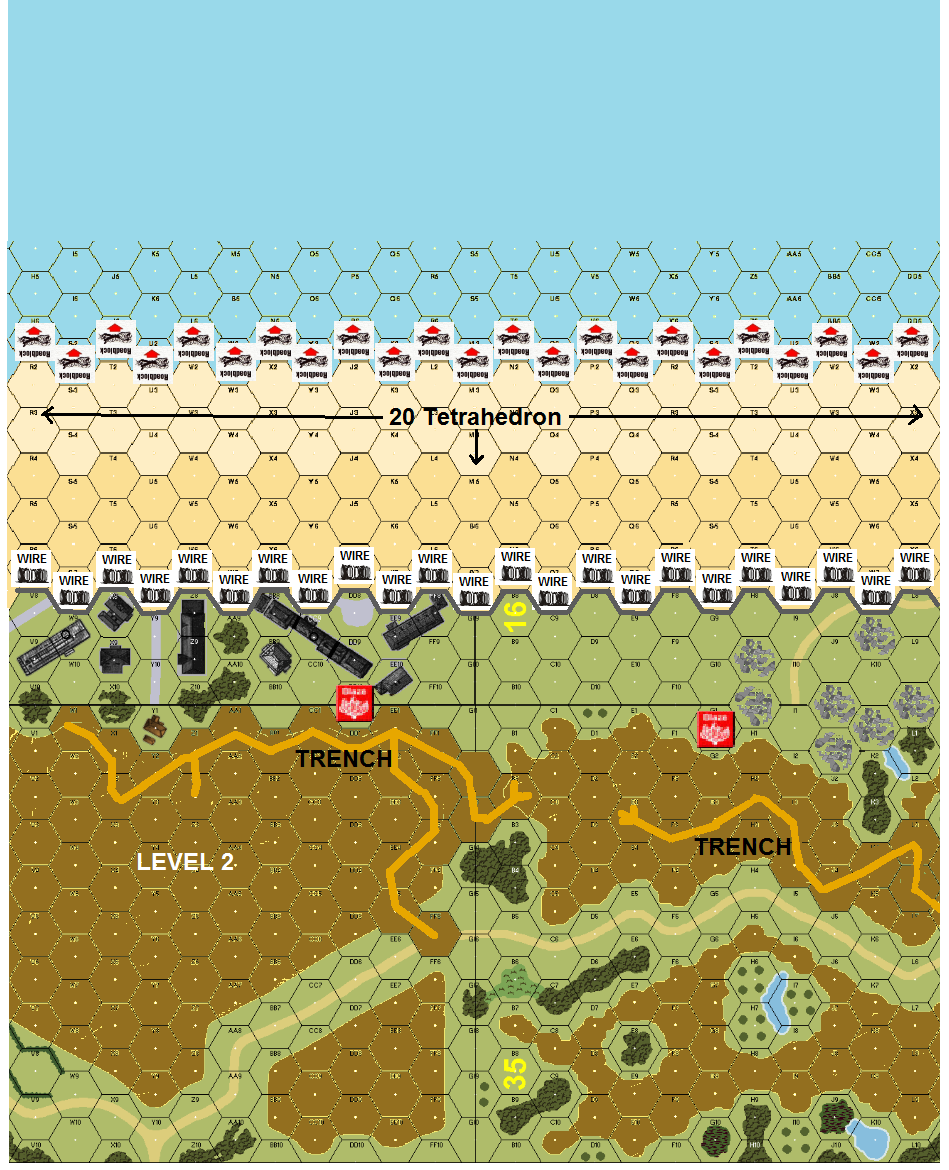 The Special engineer task Force was a vital component of the initial assault along with the infantry teams and the armor fire support. The assignment called for creation of clear lanes through the obstacles on the tidal flat. The lanes were to be 50 yards wide with eight lanes allotted to each of the infantry regiments in the initial assault and assigned to a demolition team. Demolition Team No. 1 was planned to land on the westernmost beach sector, Dog Green, but, due to the easterly flowing tidal current, the actual landing was at least one beach sector off, placing them near the boundary of Dog White and Dog Red. As the ramp dropped, accurate small arms fire covered the craft but the team scrambled into the water and headed for the seaward row of obstacles which included Element C (Belgian Gates).Attacker: American (Team No. 1, 146th Engineer Combat Battalion and A Company, 743rd Tank Battalion and F Company, 116th RCT, 29th Infantry)