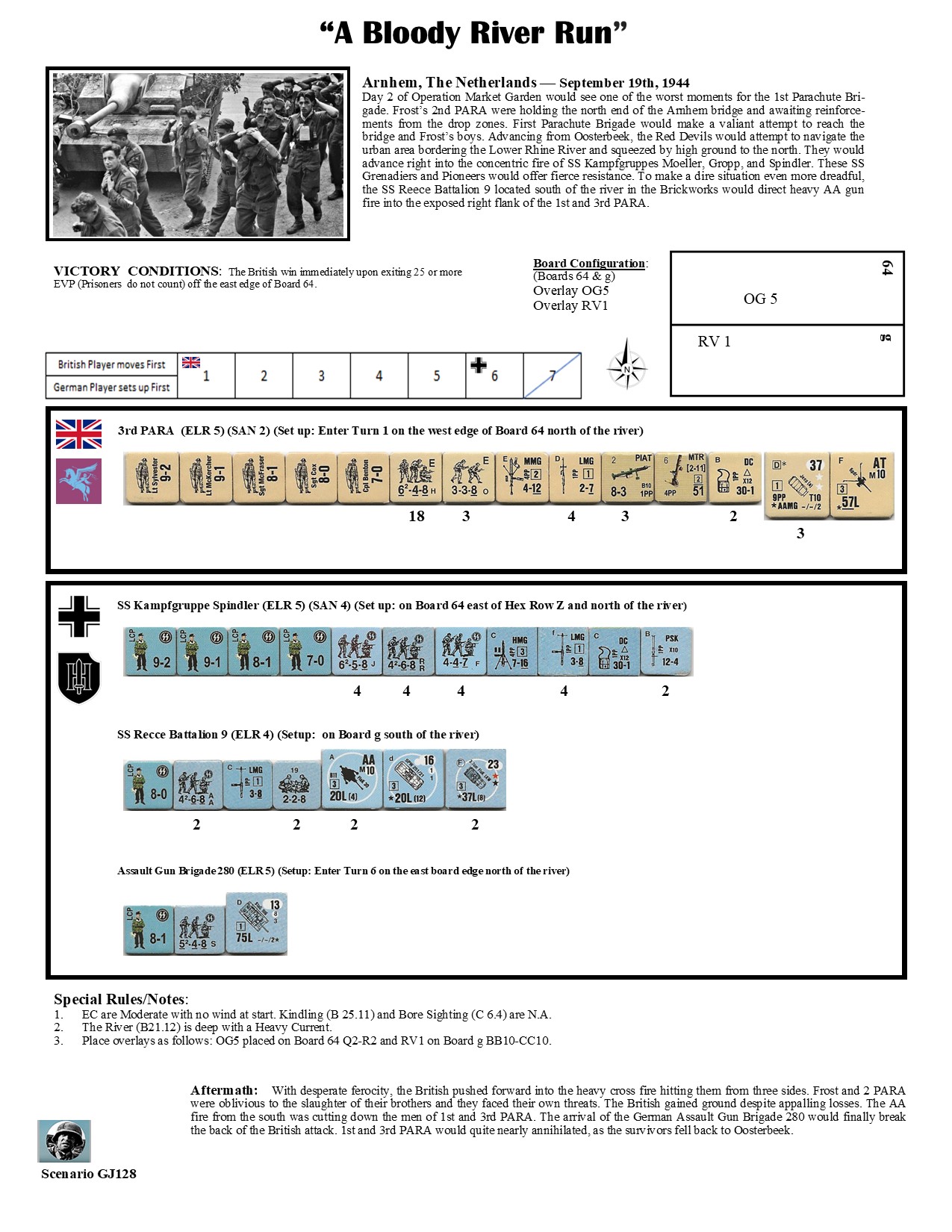 Day 2 of Operation Market Garden would see one of the worst moments for the 1st Parachute Brigade. Frost's 2nd PARA were holding the north end of the Arnhem bridge and awaiting reinforcements from the drop zones. First Parachute Brigade would make a valid attempt to reach the bridge and Frost's men. Advancing from Oosterbeek, the Red Devils would attempt to navigate the urban area bordering the Lower Rhine River and squeezed by high ground to the north. They would advance right into the concentric fire of SS Kampfgruppe Moeller, Gropp and Spindler. These SS Grenadiers and Pioneers would offer fierce resistance. To make a dire situation even more dreadful. the SS Reece Battalion 9 located south of the river in the Brickworks would direct heavy AA gunfire into the exposed right flank of the 1st and 3rd PARA.Attacker: British (3rd PARA, 1st Parachute Brigade)
